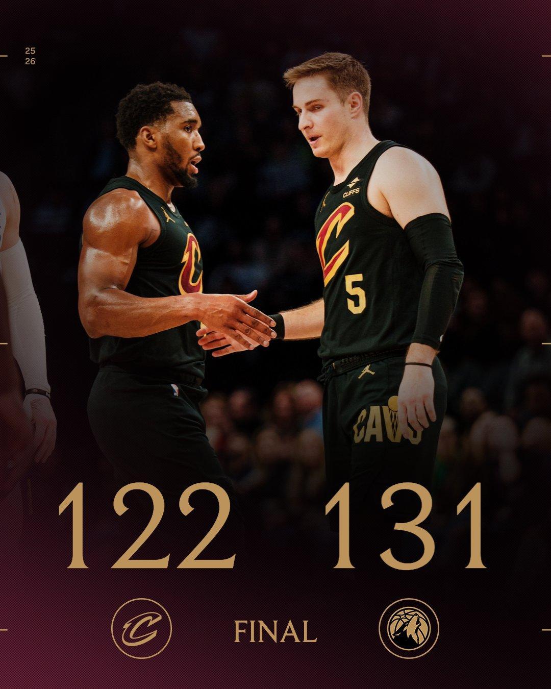 爱德华兹上篮得分,米切尔走步违例,麦克丹尼尔斯与梅里尔对射三分球。亨特大帽兰德尔,梅里尔远投不进,亨特抢断爱德华兹,莫布里暴扣。距离终场仅剩1分钟,比赛进入白热化阶段。麦克丹尼尔斯高难度单打命中,莫布里外线打铁,麦克丹尼尔斯2罚不中,兰德尔抢下前场篮板被犯规,兰德尔2罚1中,克利夫兰请求暂停。米切尔外线不中,麦克丹尼尔斯自抛自扣得手,梅里尔远投不进,比赛时间走完。最终,森林狼以131比122险胜骑士,得以拒绝了20分逆转。