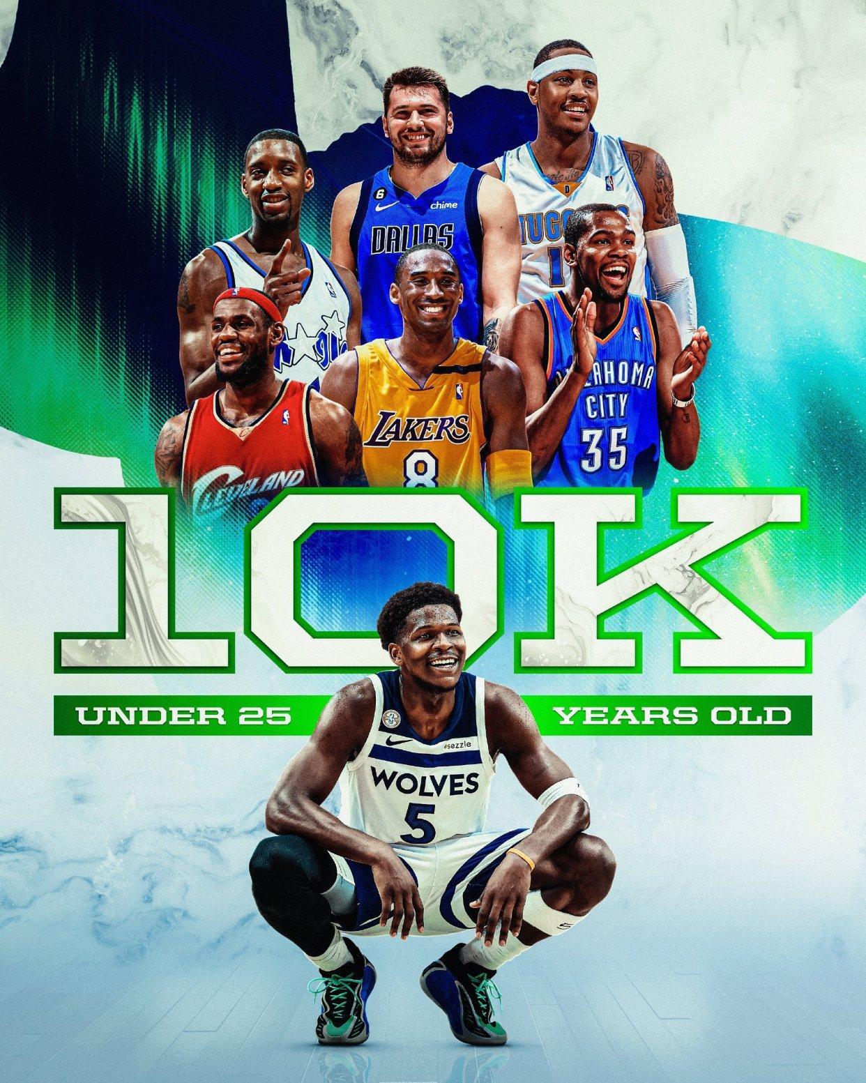 第3、爱德华兹还成为了NBA历史上第7位在年满25岁之前拿到10000分的球员,其余六人是:科比、特雷西麦克格雷迪、詹姆斯、卡梅隆安东尼、杜兰特和东契奇。