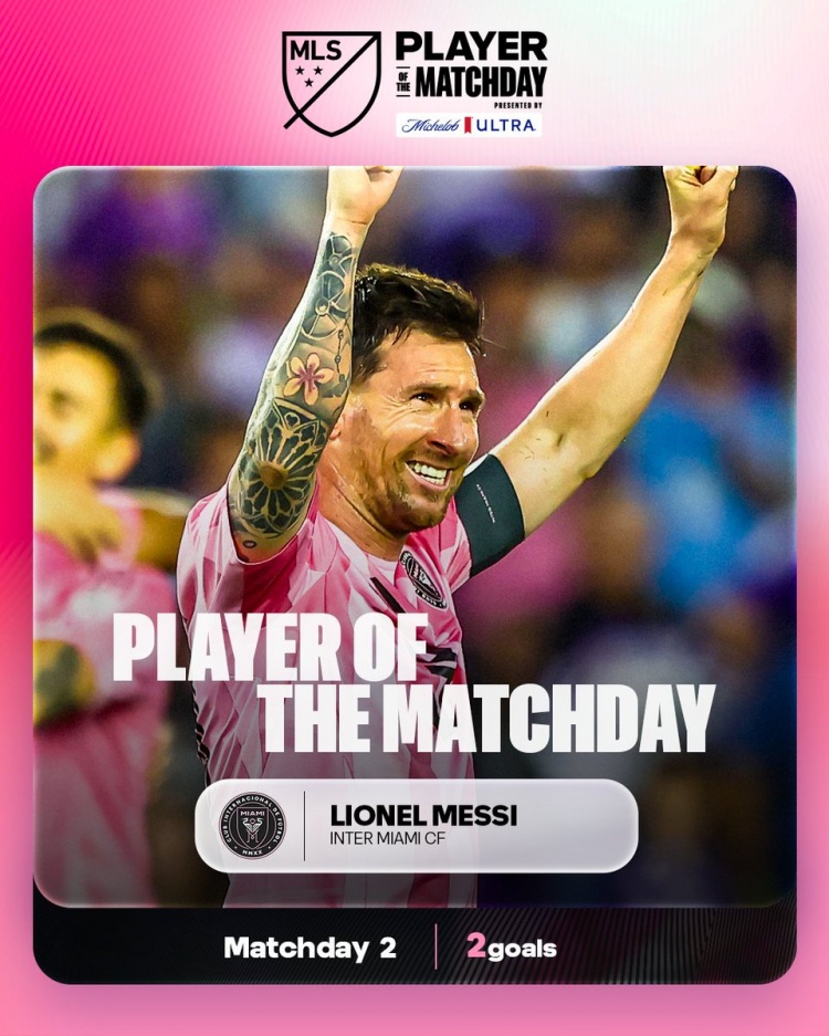 此役梅西梅开二度+造红牌,帮助迈阿密国际取胜,美职联官方宣布,梅西当选本轮比赛最佳球员。