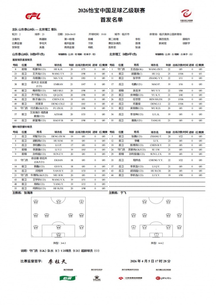4月5日讯 今天19点,中乙第二轮,山东泰山B队坐镇临沂奥体公园体育场迎战北京理工,赛前双方首发公布,依木兰连场代表泰山B队出战。